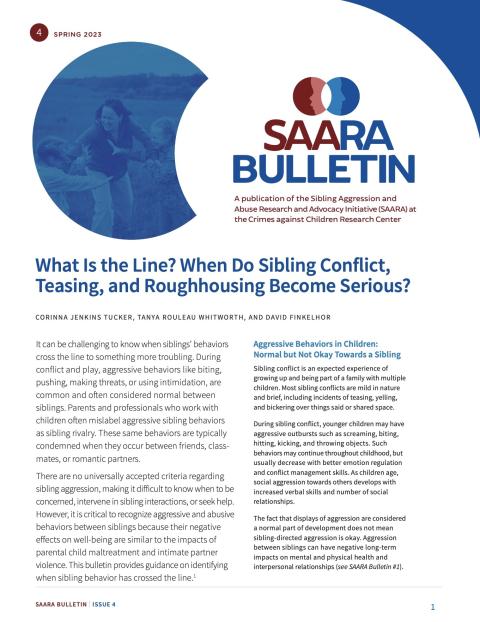 There are no universally accepted criteria regarding sibling aggression, making it difficult to know when to be concerned, intervene in sibling interactions, or seek help. However, it is critical to recognize aggressive and abusive behaviors between siblings because their negative effects on well-being are similar to the impacts of parental child maltreatment and intimate partner violence. This bulletin provides guidance on identifying when sibling behavior has crossed the line.1