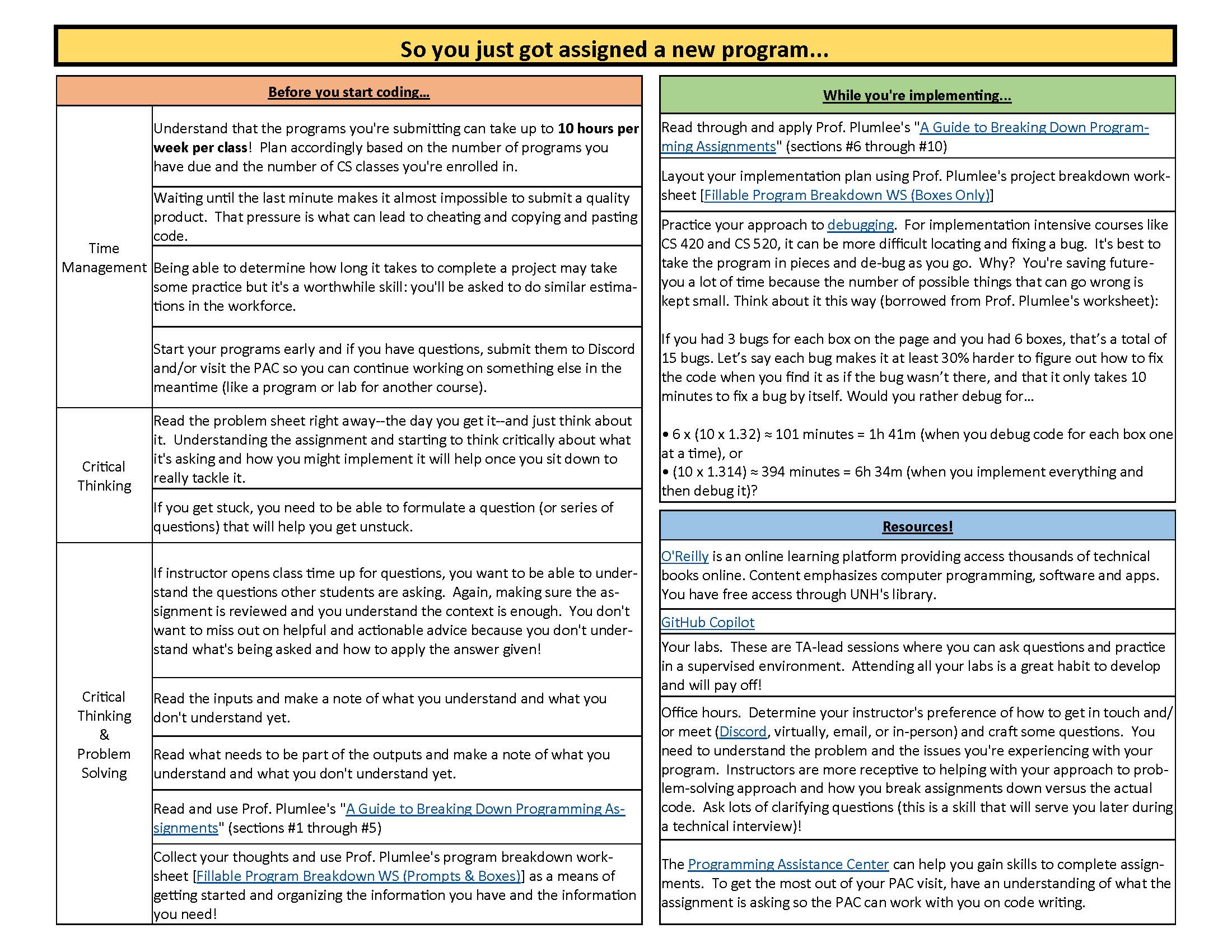 Hello, world! Welcome to the CS resource page! Use the resources and worksheets to unpack how to approach your next programming assignment. Programming Assistance Center Helpful Worksheets A Guide to Breaking Down Programming Assignments Fillable Program Breakdown Worksheet: Prompts & Boxes Fillable Program Breakdown: Boxes Only Important Resources O'Reilly GitHub Copilot UNH's Discord Server Approaching debugging Unpacking programming assignments