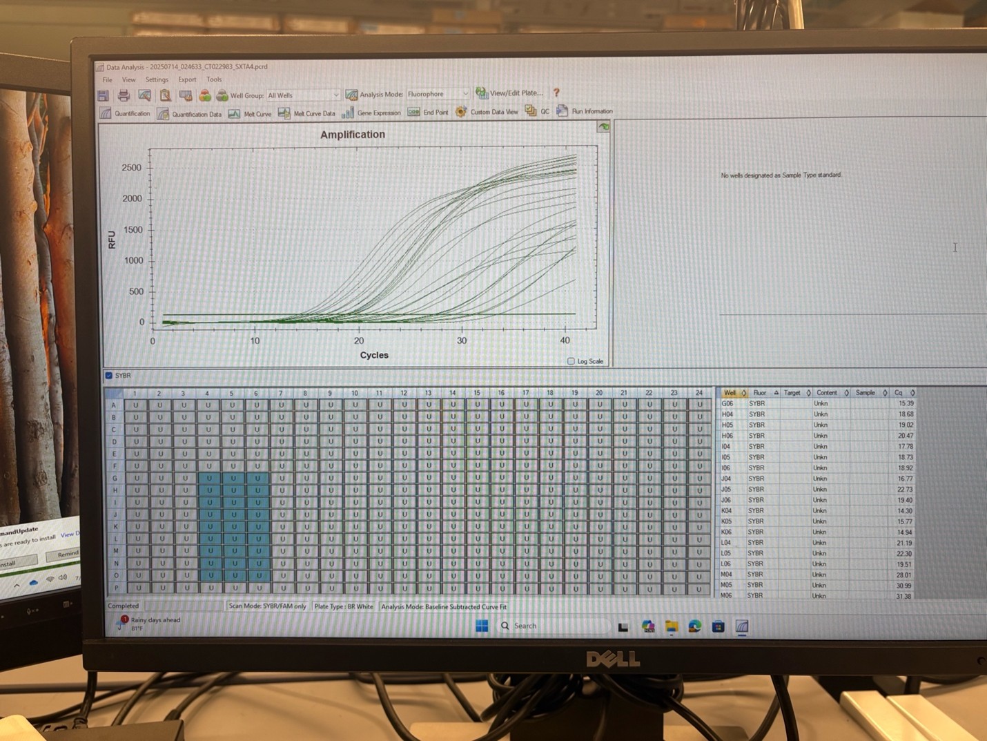 qPCR amplification plot using Bio-Rad Real-Time PCR Analysis Software showing the successful standard curve I established for sxtA gene expression in Alexandrium spp. This curve was created using dilution series samples to correlate gene copy number with cell abundance, marking a major milestone in my SURF project.