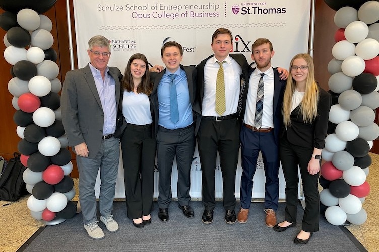 Ian Grant, executive director of the Peter T. Paul Entrepreneurship Center, joins students Daisy Burns '24, Jason Plant '23, Derek Long '23, Matthew Oriente '23 and Katie Remeis '23, who earned first place at the national E-Fest competition in Minnesota. (Courtesy photo)