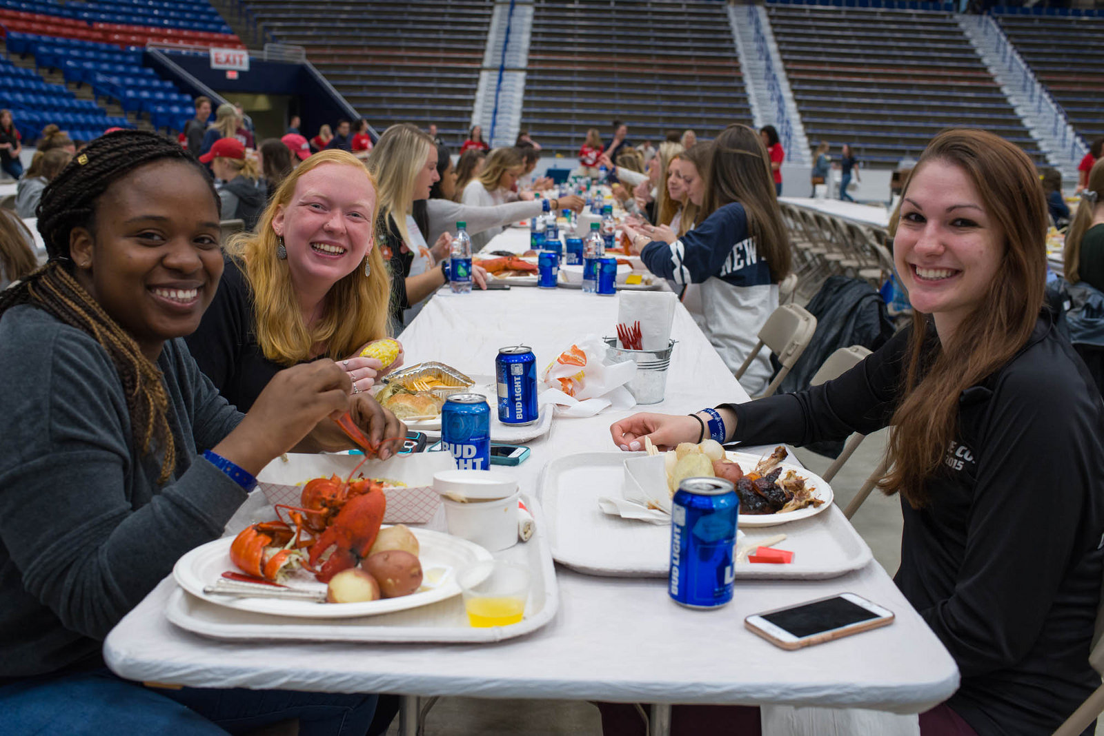 UNH seniors celebrating their impending graduation with classmates over lobster in the rough