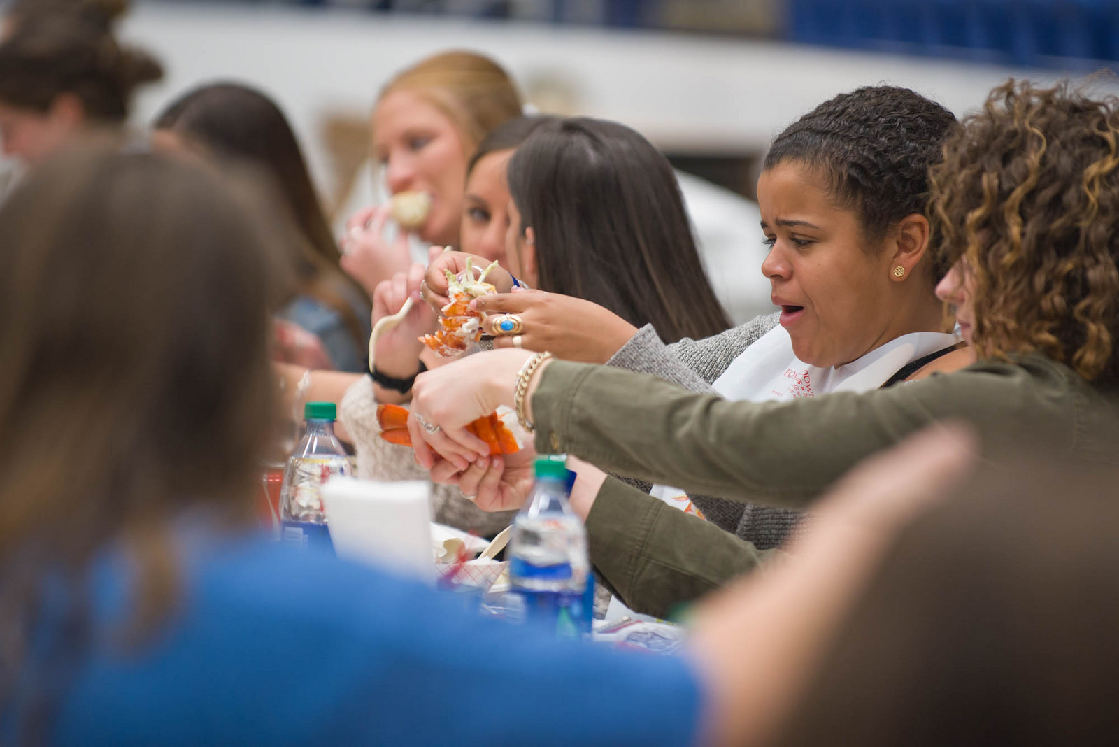 UNH seniors celebrating their impending graduation with classmates over lobster in the rough