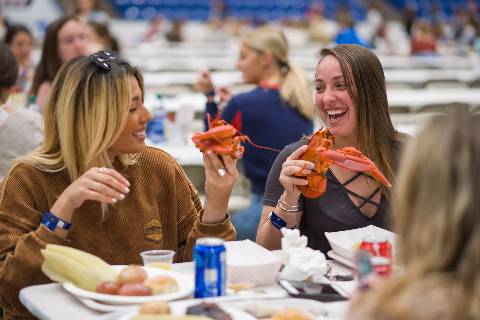UNH seniors celebrating their impending graduation with classmates over lobster in the rough