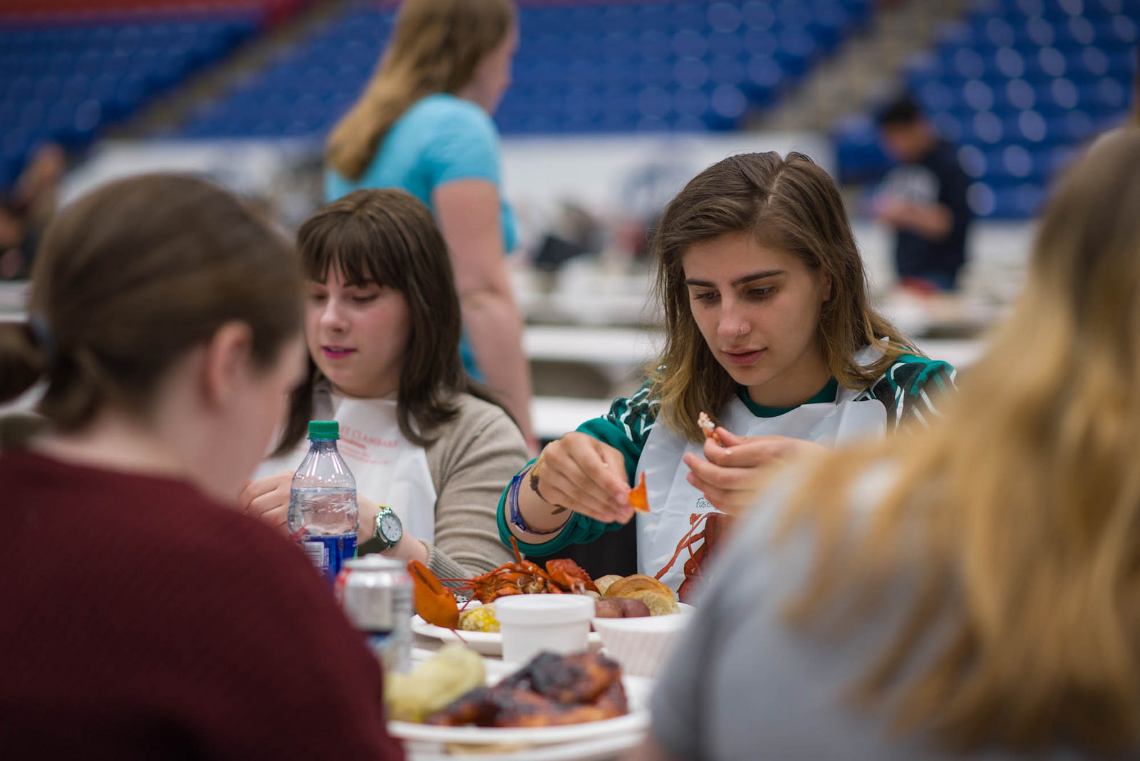 UNH seniors celebrating their impending graduation with classmates over lobster in the rough