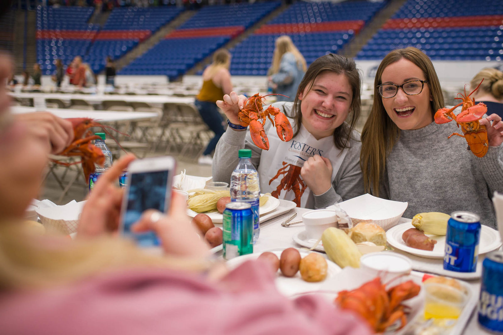 UNH seniors celebrating their impending graduation with classmates over lobster in the rough