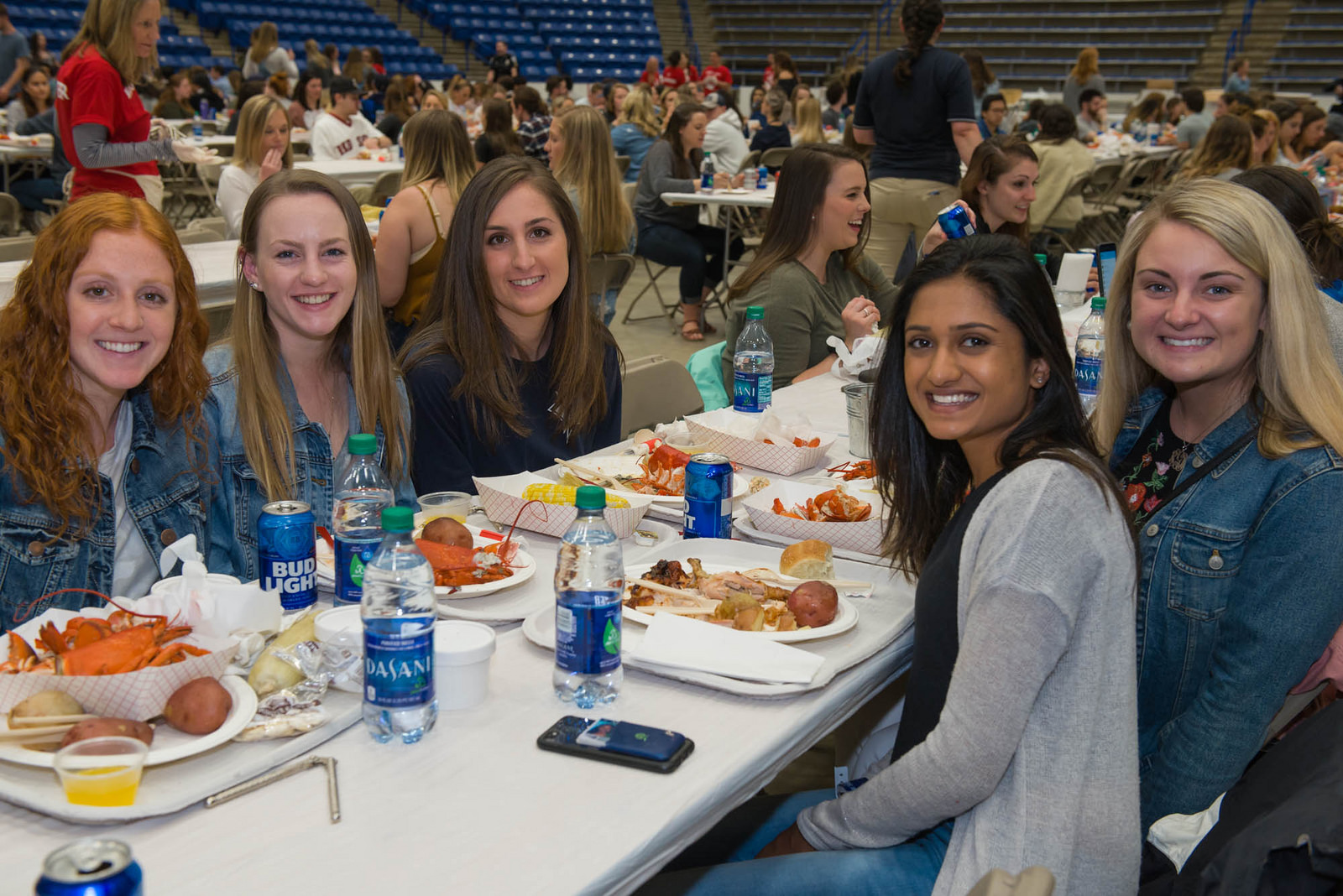 UNH seniors celebrating their impending graduation with classmates over lobster in the rough