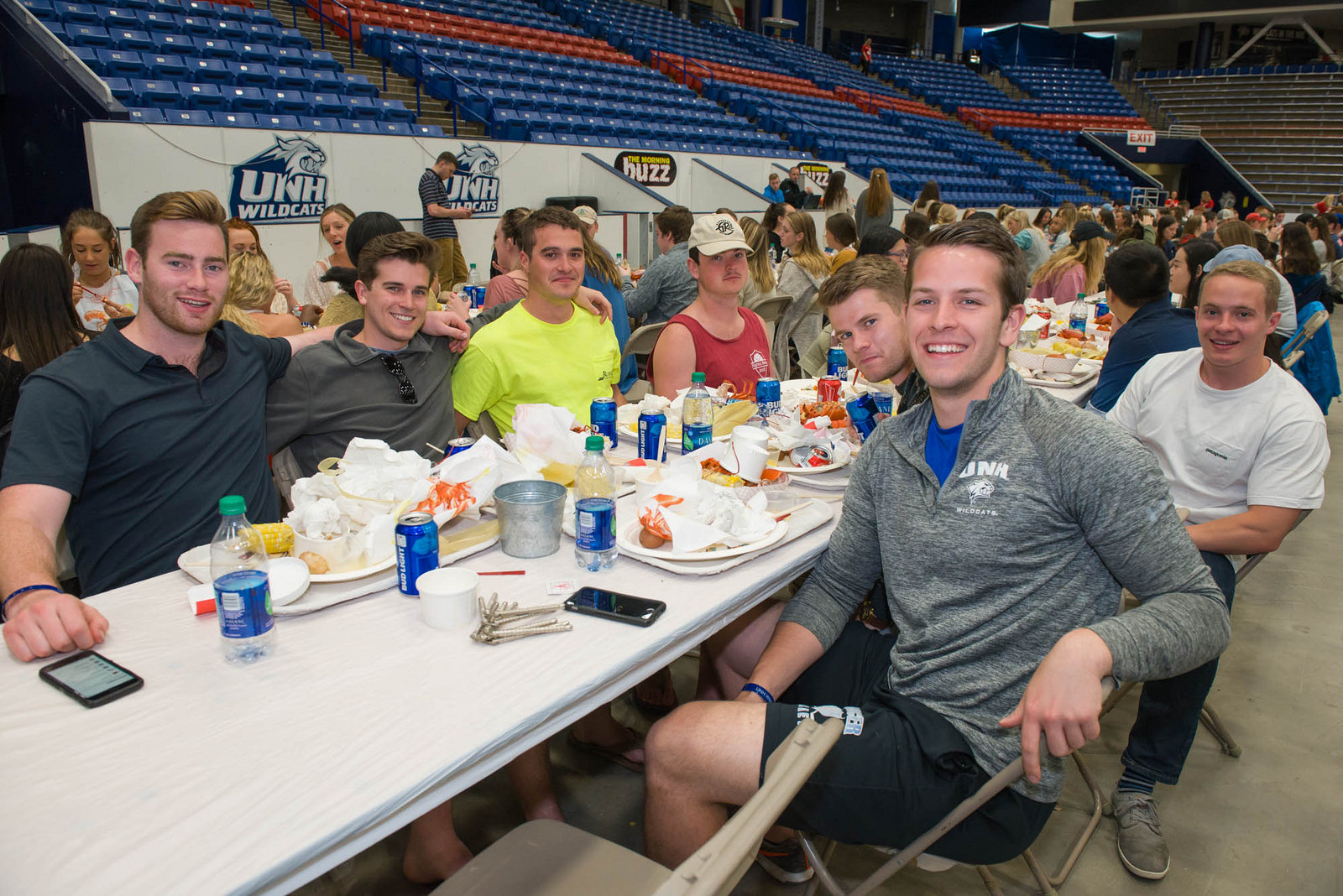 UNH seniors celebrating their impending graduation with classmates over lobster in the rough