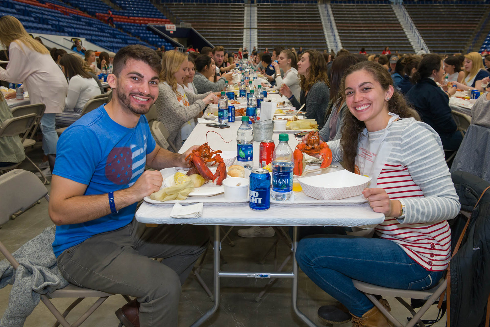 UNH seniors celebrating their impending graduation with classmates over lobster in the rough