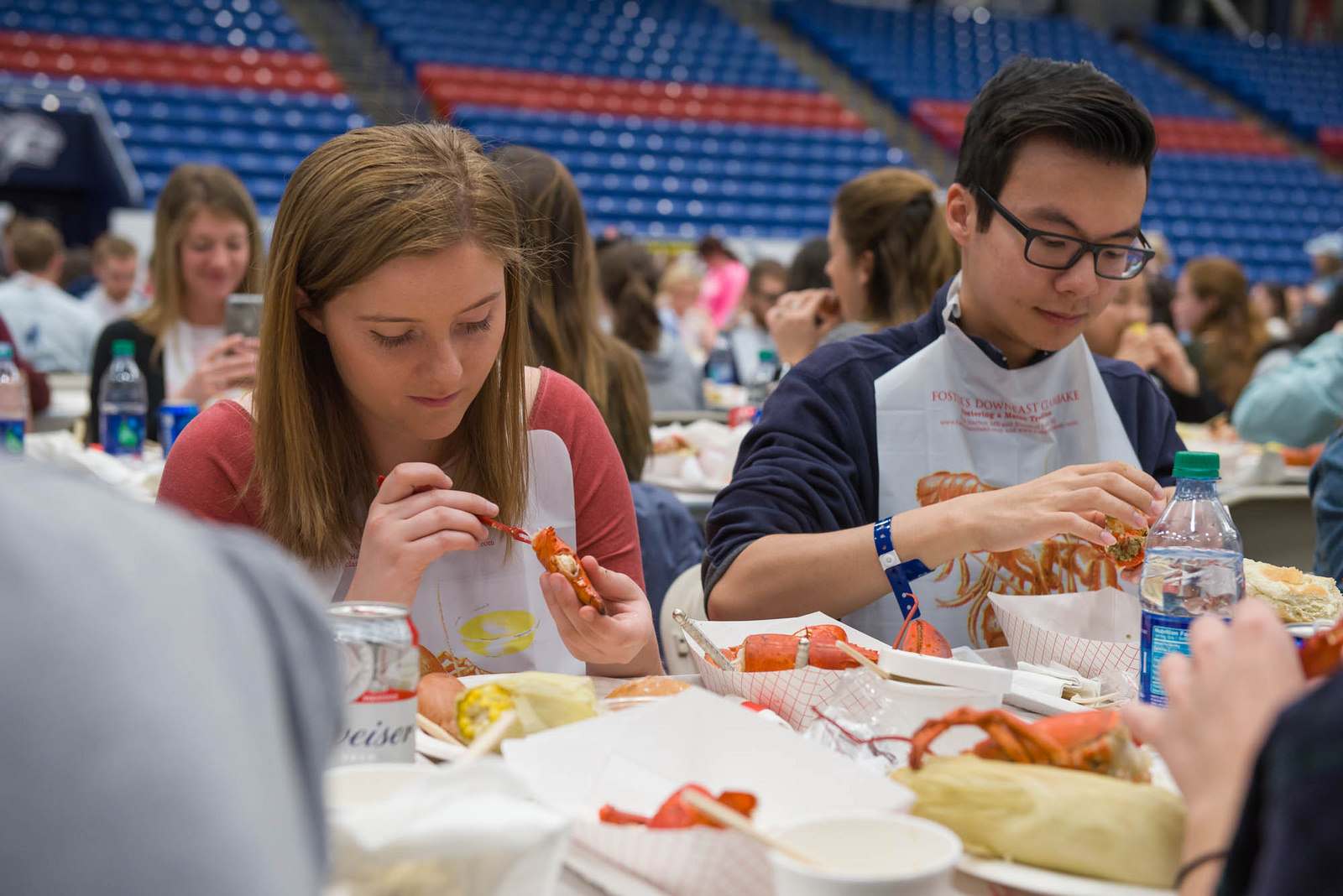 UNH seniors celebrating their impending graduation with classmates over lobster in the rough