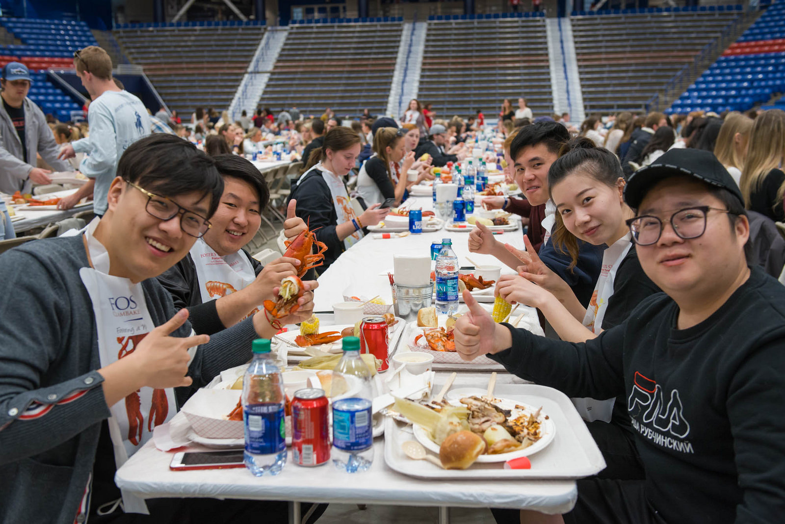 UNH seniors celebrating their impending graduation with classmates over lobster in the rough