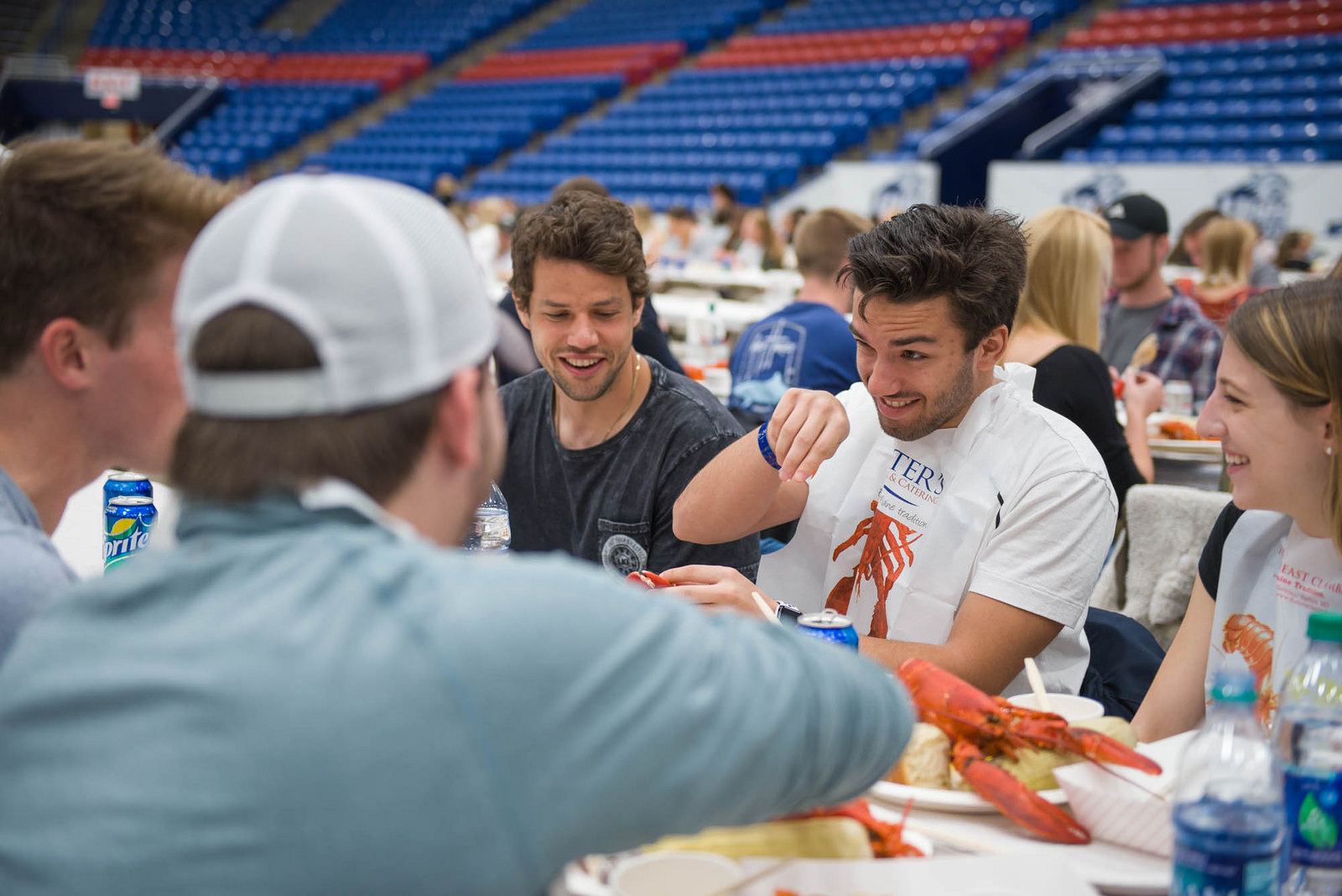 UNH seniors celebrating their impending graduation with classmates over lobster in the rough