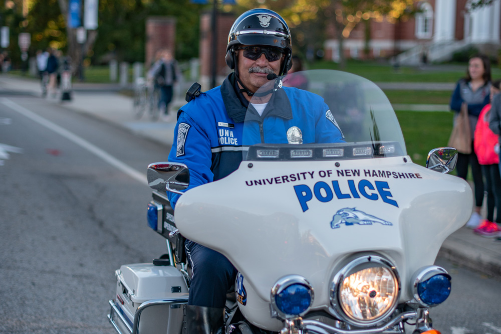 An officer rides a motorcycle in UNH's Homecoming Parade 2018