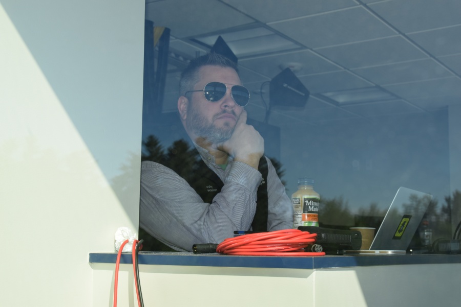 A male student wearing glasses mans the DJ booth in the WUNH studio