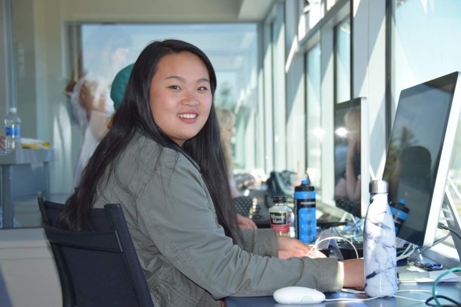 A male student wearing glasses mans the DJ booth in the WUNH studio