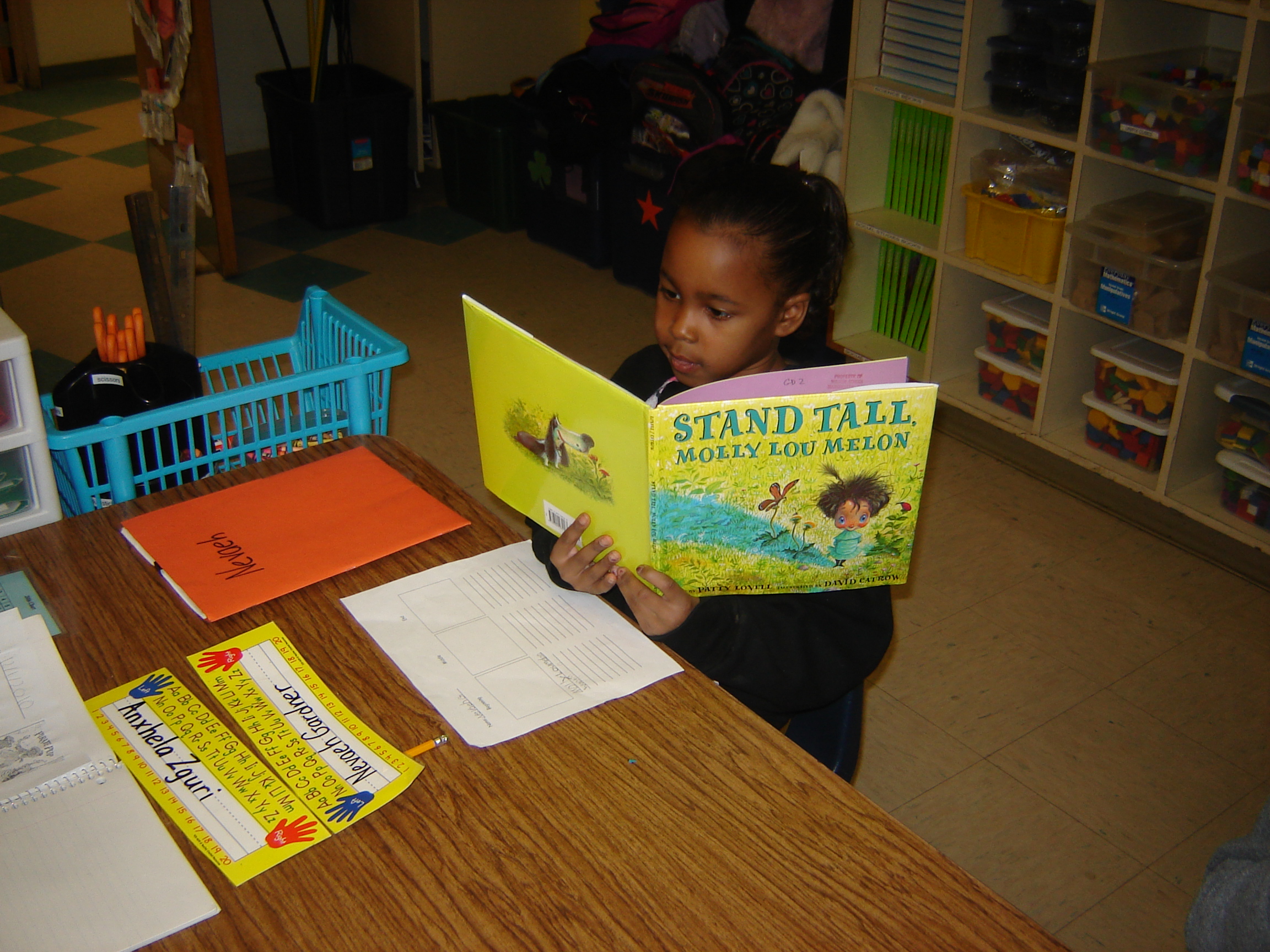 Cutline: A second-grade student at Wilson Elementary School in Manchester reads "Stand Tall Molly Lou Melon" as part of UNH's Community Leadership Program "Reading Makes A Difference."