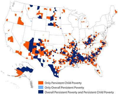 - Counties with persistent child poverty cluster in Appalachia, the Mississippi Delta, other areas of the Southeast, parts of the Southwest, and in the Great Plains.